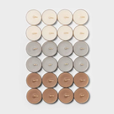 Brighten up your indoor and outdoor spaces instantly with this 24-Pack of Tealight Candles from Threshold™. Great for everyday use or special occasions, this pack of cylindrical tealights in three colors brings warm style to any space. They feature the lovely scents of vanilla bean & amber, cozy cashmere and ashwood & palo santo to help you create a lovely ambiance, and each one burns for up to 4 hours.