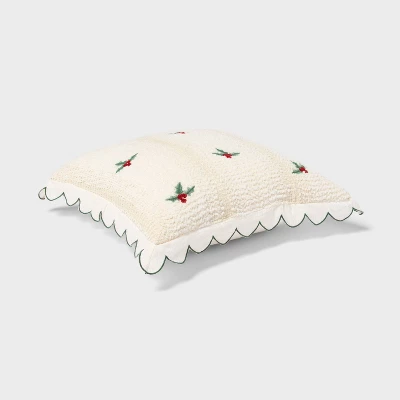 Bring an artistic touch to your seasonal decor with the Holiday Embroidered Boucle Decorative Throw Pillow from Threshold™. This off-white throw pillow features poinsettia embroidery and scalloped sides with contrasting green trim. Made of a mix of polyester, cotton and other fibers with 100% polyester filling, this decorative throw pillow is finished off with a sewn-seam closure for a neat look.