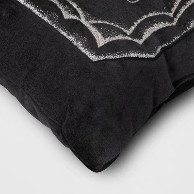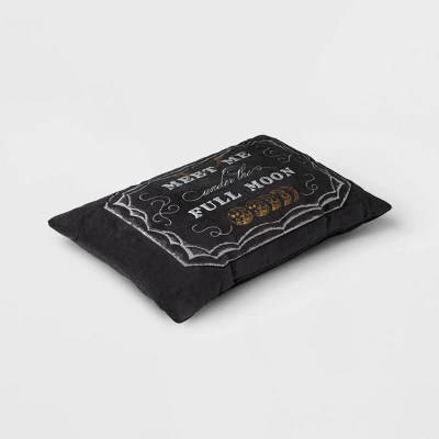 Bring a Halloween vibe to your decor by decorating with the Lumbar Full Moon Pillow from Threshold™. This black lumbar pillow features the embroidered text “Meet me under the Full Moon” along with illustration of various phases of moon for an eerie feel. Made of 100% cotton fabric with 100% polyester filling, this pillow helps you lean back in comfort.