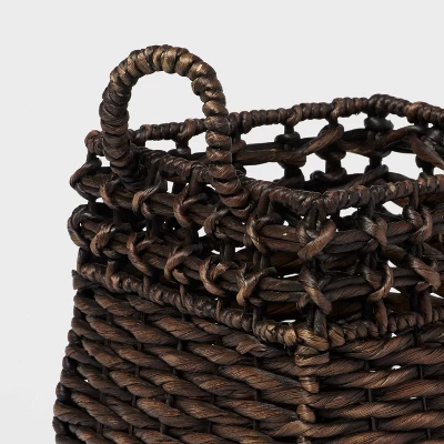 Add an appealing look to your interior decor while keeping it organized with the Rounded Square Chocolate Woven Basket with Lid from Threshold™. This square basket is made of water hyacinth and features a woven design for textured appeal that complements your decor well. It has a lid to help keep your throws, blankets, and other items nicely contained and covered, adding natural charm to your space.