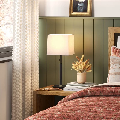Bring extra lighting to any space in your home with the Square Base Stick Lamp with USB from Threshold™. This black table lamp features a square base with a contrasting shade for a modern look. Designed with a one-way light setting, this square base lamp has a socket pull chain for easy operation, and the USB port lets you charge your devices while the lamp is in use.